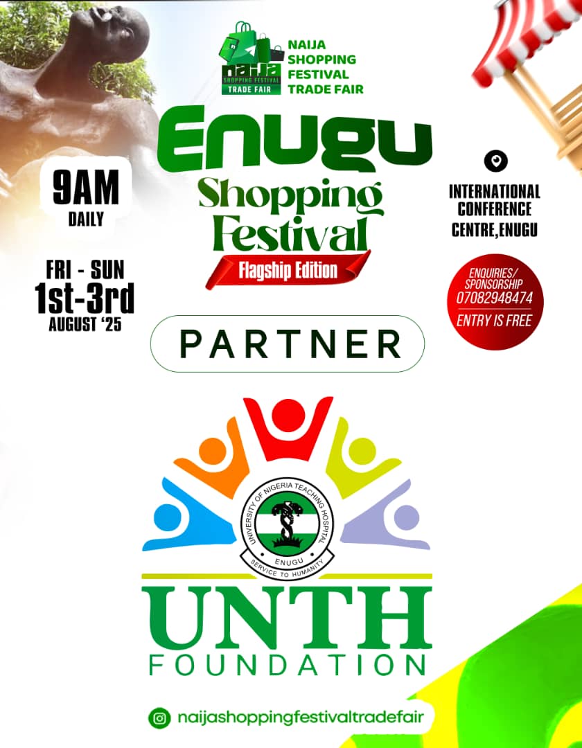 The UNTH Foundation is proud to announce its partnership with the Naija Shopping Festival Trade Fair for the upcoming Enugu Shopping Festival. This flagship edition will take place from August 1st to 3rd, 2025, at the International Conference Centre in Enugu.